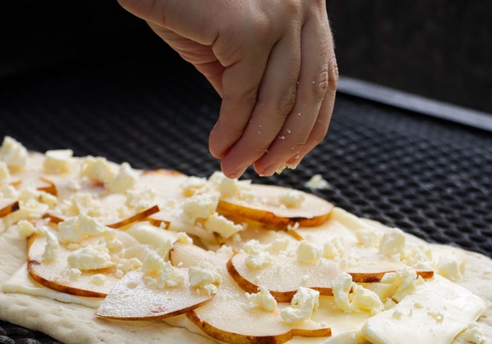 - Dar vuelta la masa y añadir el Queso Quartirolo en la base, luego las láminas de Pera y por encima el Queso Feta desgranado. Cubrir con un poco de aceite de oliva y cocinar cubierto durante unos 5 minutos más.