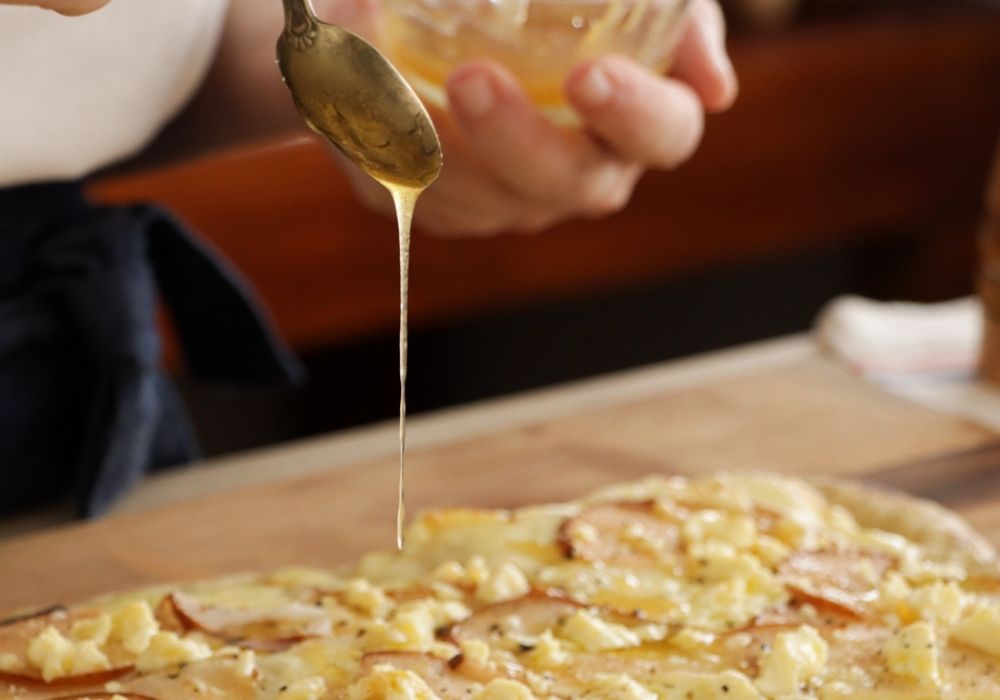 - Retirar del fuego, añadir unos hilos de miel, pimienta a gusto, cortar en porciones y disfrutar
